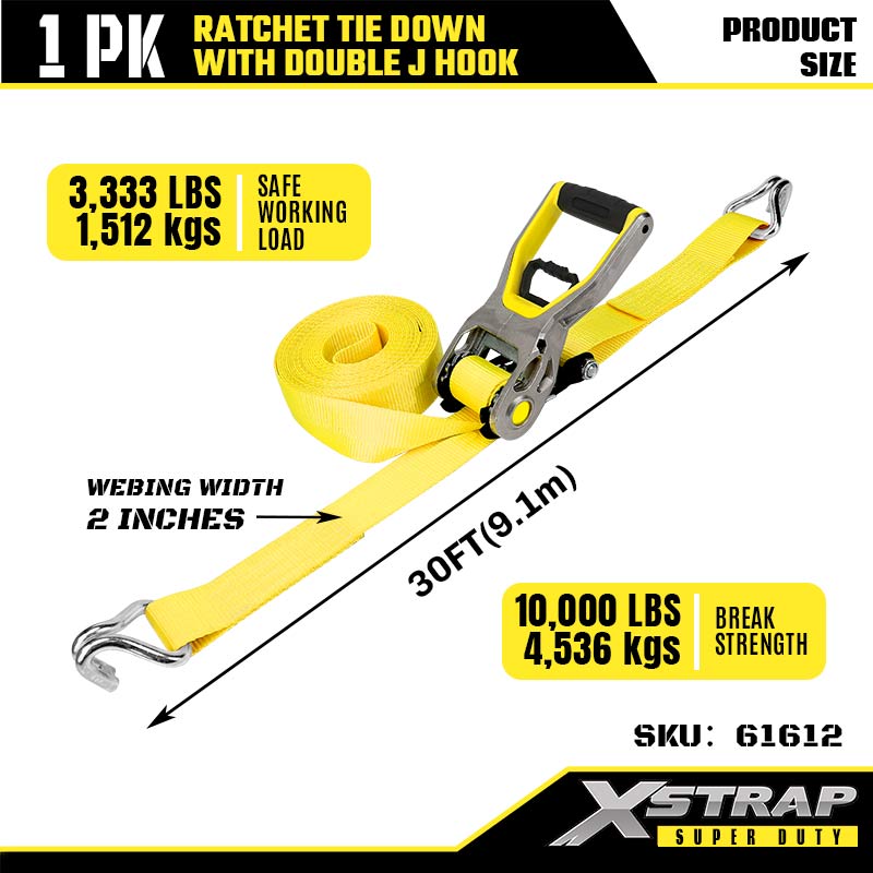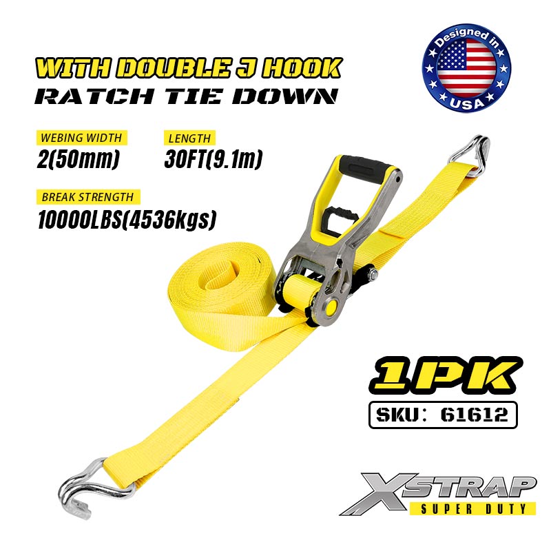 Xstrap 2PK Ratcet Tie Down dengan Double J Hooks, 2” x 30’ Poliester Tie Down Strap Ratchet Strap, 3333lbs Kapasiti Ikatan Kargo Tali Pengaman dengan Double J Hooks untuk Treler Tugas Berat, Bot Ski Treler Katil Rata, Kereta Kecil, Peralatan Berat.