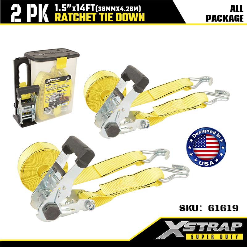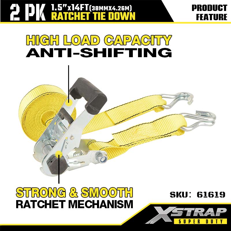 Xstrap 2PK Ratcet Tie Down dengan Double J Hooks, 1-1/2” x 14’ Poliester Tie Down Strap Ratchet Strap, 1667lbs Kapasiti Ikatan Kargo Tali Pengaman dengan Cangkuk J Double untuk Treler Tugas Berat, Bot Ski Treler Katil Rata, Kereta Kecil, Peralatan Berat.